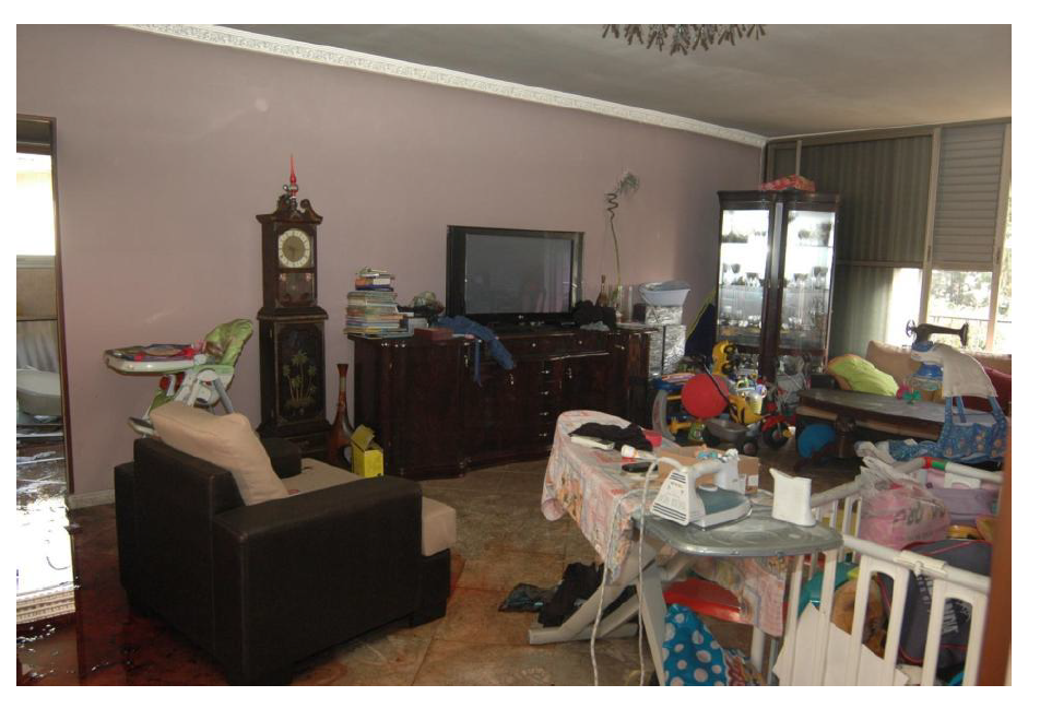 בחדר השינה הראשון מימין, יש את גופת האשה צעירה, וגופת הסבא מתחת למיטה, למרגלות המיטה, ובלול יש כתמי דם של התינוק: זה חדר אחד.